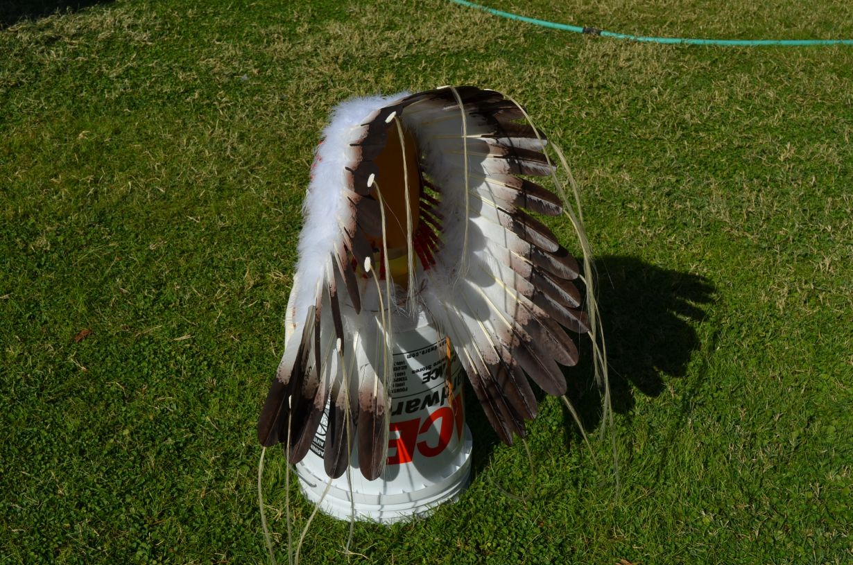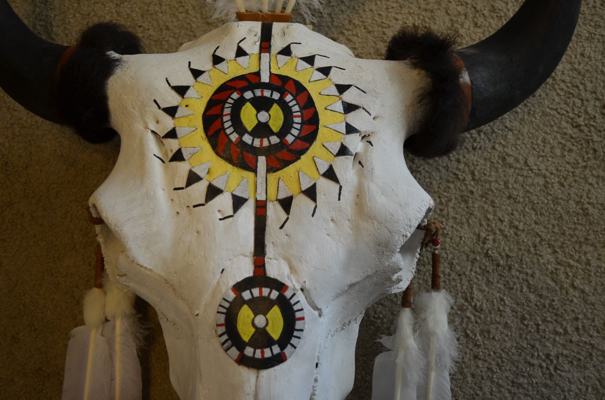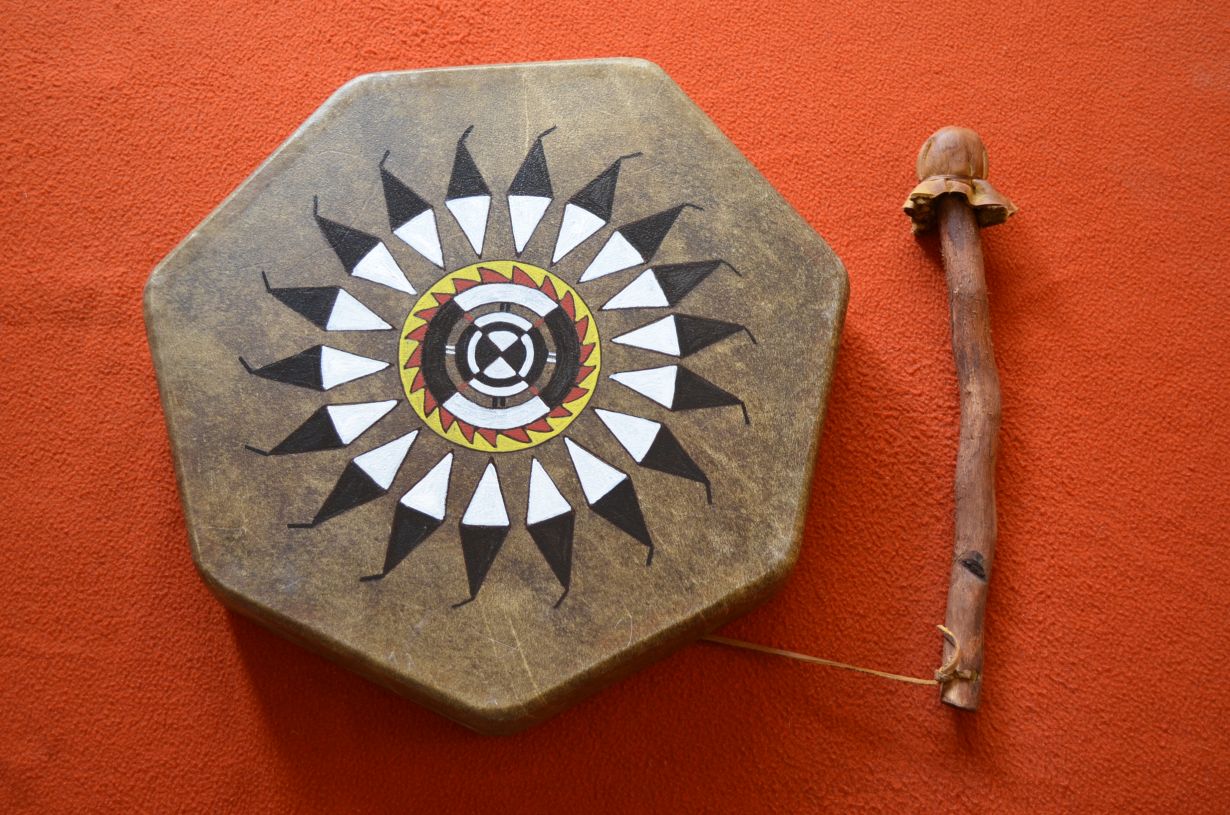 War bonnet Drum - $230.00 Hand drawn rawhide over an hand made frame. Working drum, It has a great sound! Hand made and painted by Lavern Little 15.5" Diameter Sold |