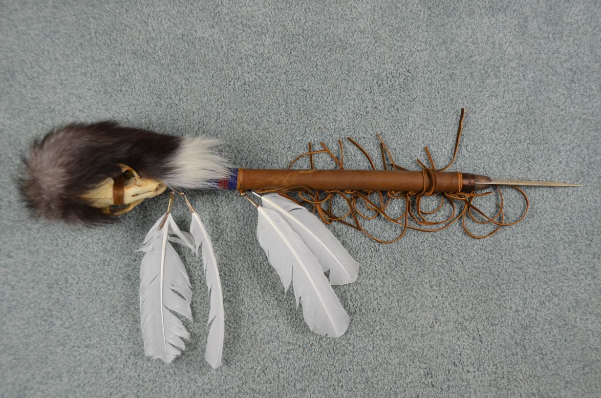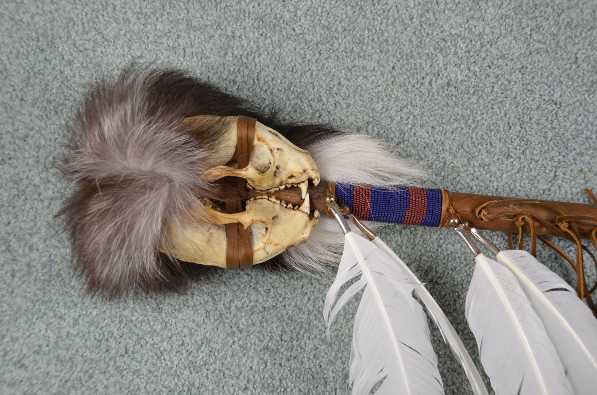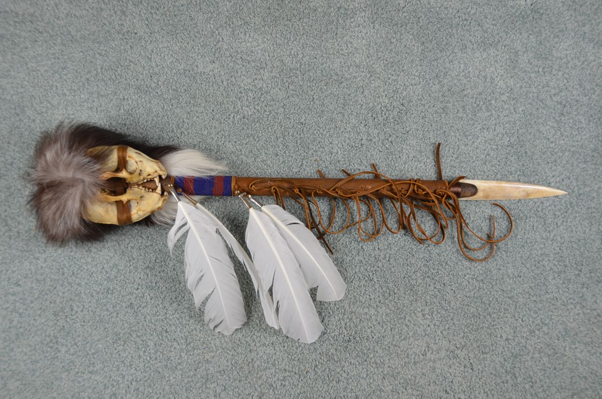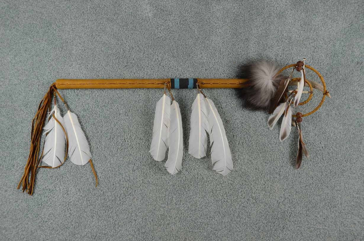 ![]() $100.00 Fancy dance stick with a "Eagle" Claw and Bells 31" long, the claw itself is over 4" long and 2" wide! Dakota Sioux colors and Lavern's painted feathers. with Coyote Fur Sold |